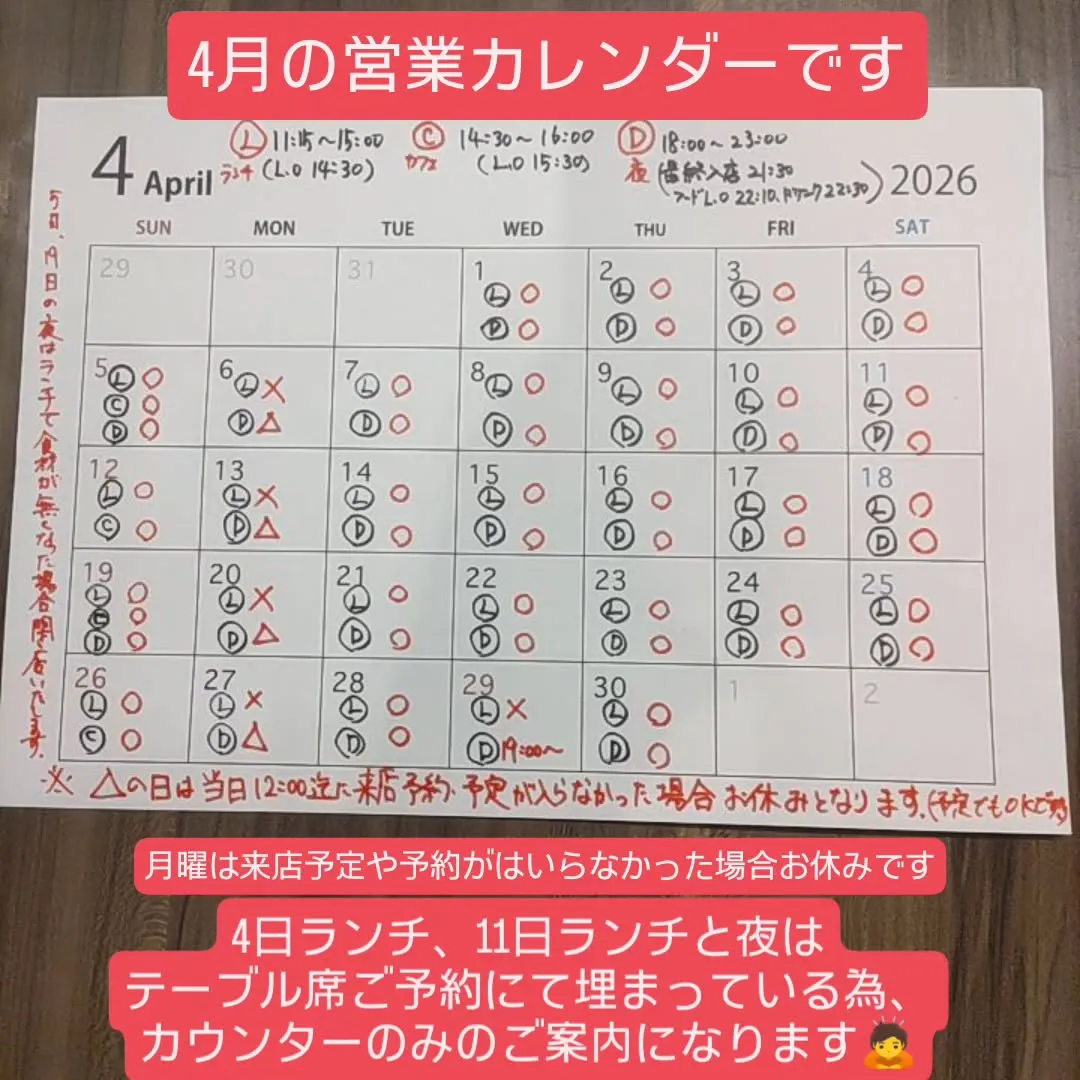 4日のランチ、11日のランチと夜はテーブルは全てご予約いただいていますので、カウンターのみのご案内となります❗️